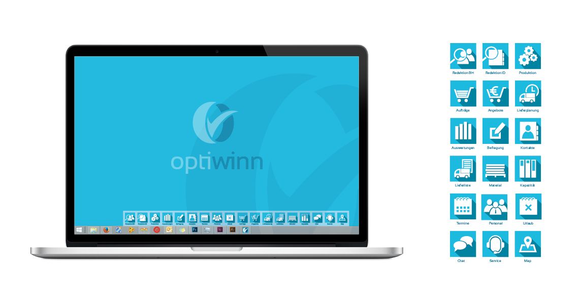 verstehen – optimieren – gewinnen. Mit individuellen CRM-Lösungen für jede Branche erleichtert Optiwinn Arbeit und Leben. Für die Software-Marke entwickelte Müller Marketing das grafische Gesamtkonzept – vom Logo über das Layout der Firmenpapiere bis hin zu einer Icon-Serie im Flat- und Long-Shadow-Design für die einzelnen Software-Module.